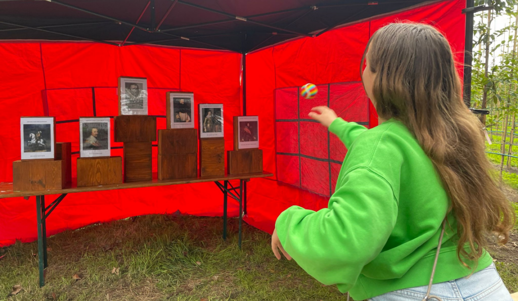 Op de keerdijk te Den Dungen heeft de Groene Vesting een infostand staan waar kinderen ballen kunnen gooien op de legeraanvoerders uit die tijd.